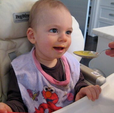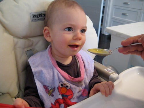4. Stay focused! Baby is there to eat, so make sure meal time is always in the same place and go through a ritual. We always tell him that we’re going to put him in his high chair, we wash off his hands with a moist towel, show him his bib and put it around his neck, hand him the bowl and spoon and then start eating. This way he knows what to expect.