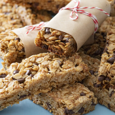 Homemade granola bars are a bit of a passion of mine, and this chocolate chip version is one of our favorites. This snack in particular is great for traveling which is always a good time to have snacks ready to go. Especially with kids!