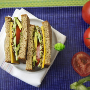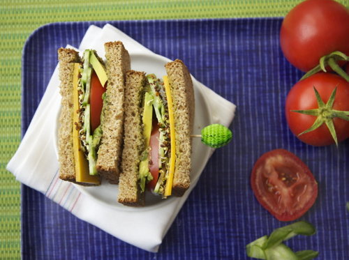 - Layer avocado slices, tomato slices, cucumber slices, sprouts and cheese on two slices of bread and top with remaining bread slices.