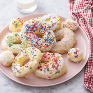 - Fun activity for kids – Chloe and I love whipping up a batch of these on the weekends for a little treat. It’s so much fun to decorate them with all the icing and dye free sprinkles! They would be a great activity for a kid’s birthday. Let everyone decorate their own donut and enjoy. And don’t forget to save the cutouts to make donut holes!