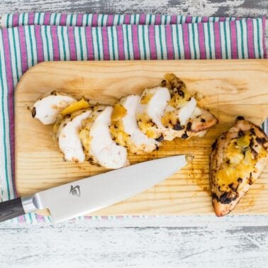 - Place the lemon, chicken breasts and olive oil in a bowl and toss to coat. Set aside to marinade for 10 minutes.