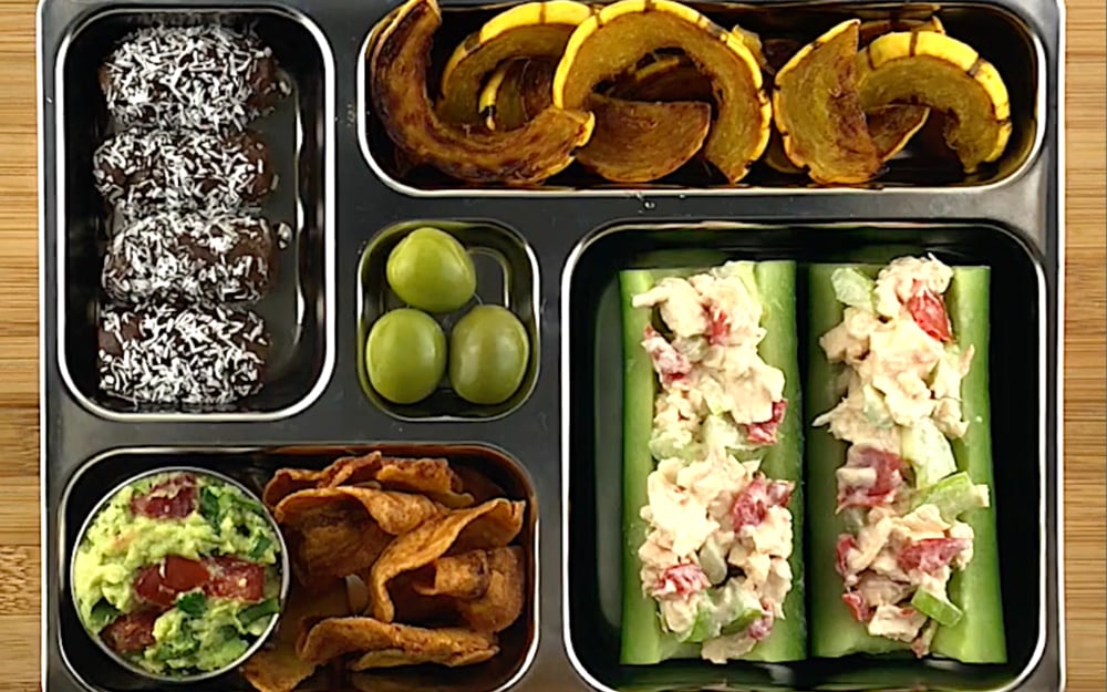 You loved the previous Whole 30 lunch, so here we go again! You can have quick, easy, and delicious meals even when they are free of sugar, grains, soy, and dairy! I know, it surprised me too! This Whole 30 lunch has a little bit of everything you crave: chicken salad served in cucumber boats – you won’t even miss the bread! Sweet date nut bites (using cashews instead of walnuts), homemade guacamole with plantain chips for dipping, roasted squash with cinnamon, and a few green olives for something salty and crisp! If you’re following the Whole 30 right now, how is it going for you?!