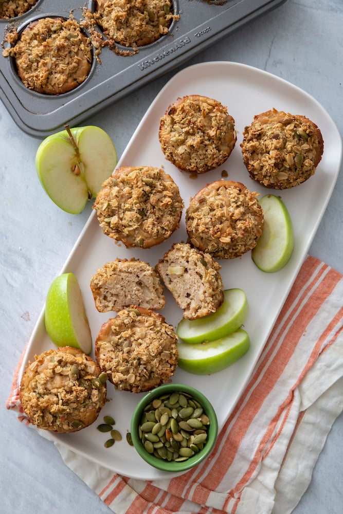 I love offering up easy, healthy recipes that are easy to make for toddlers, pre-dinner snacks or sports practice pick me-ups and these Apple Pie Muffins are just that! And, just like my Baked Apples with Cinnamon and Raisins, they aren’t too sweet and don’t have a ton of sugar, so they’re a great breakfast treat too. I put these in Gemma’s lunchbox all the time and even will make extras to freeze and have on hand for the months to come.