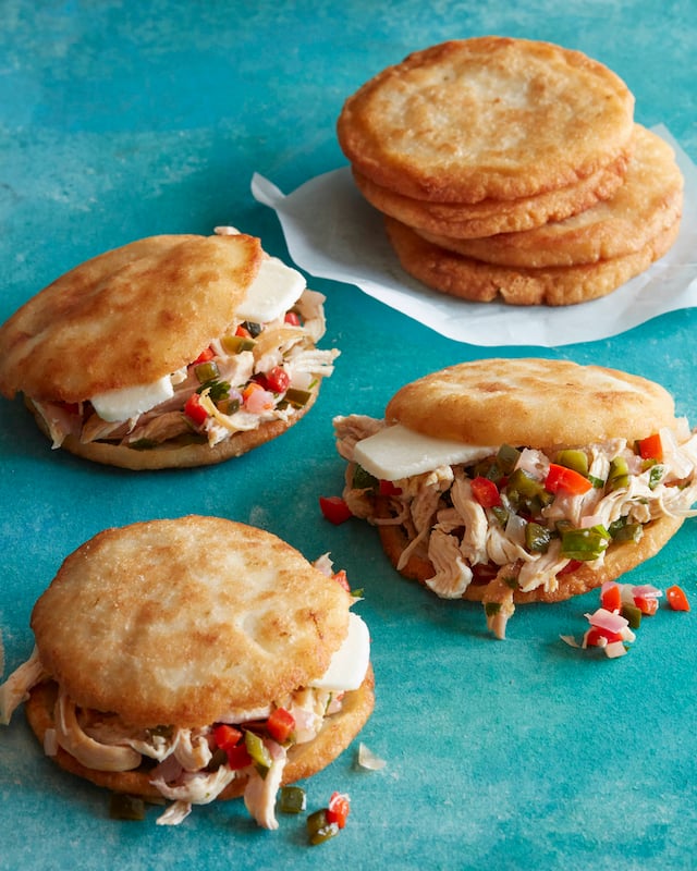 - When cool enough to handle, cut Arepas horizontally in half. Place chicken mixture and cheese on the bottom half of Arepas. Top with other half and serve.