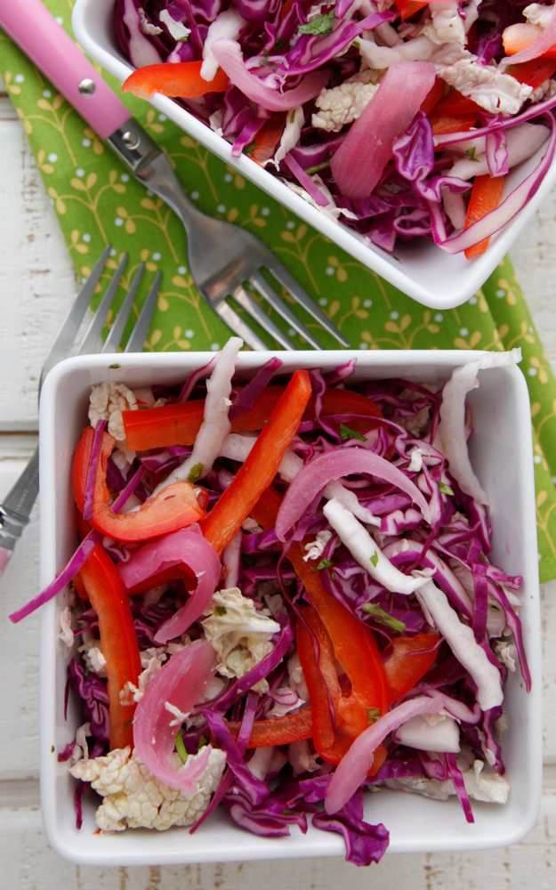 There’s something about vibrantly colored vegetables like crunchy purple cabbage and sweet red bell peppers mixed with tangy vinegar and just a touch of sugar that makes this Asian Slaw especially kid friendly. To make it even more enticing I give my little ones a shaker of toasted sesame seeds or even a small handful of chopped cashews or peanuts to sprinkle on top.