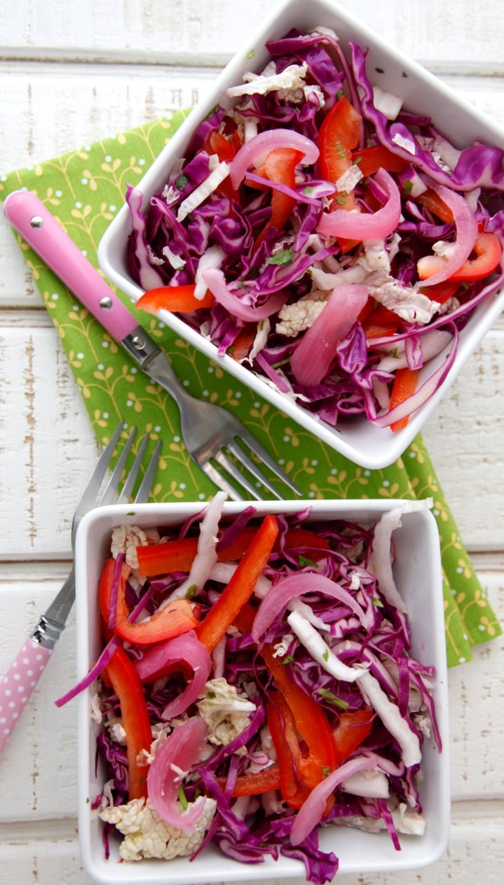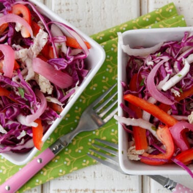 While slaws made with a creamier sauce can be awfully tasty, this side slaw won’t spoil if it’s sitting out in the summer sun during a picnic because it’s mayo free, making it safer to eat and a lot healthier to boot. It can also be used in a ton of different ways. Place it on top of tacos, toss it with some shredded chicken for a flavorful salad, use it as a side for Lazy BBQ Chicken…or just eat a big bowl of it on it’s own!