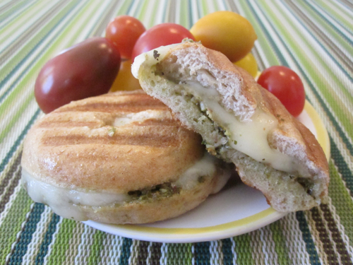In our house, pesto has as many, if not more, uses then tomato sauce. I’ve started to keep pesto in the fridge at all times because of it’s versatility and the fact that my kids love it. Not only is it great as a sauce for pasta, it’s also a great spread for sandwiches, like these cheesy bagel paninis. It’s sort of like a grilled cheese, updated with a little extra zip.