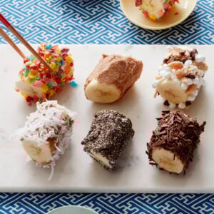 - Cut the bananas into 1 1/2-2 inch pieces, roll in almond butter OR whipped cream cheese and roll in any desired coating.