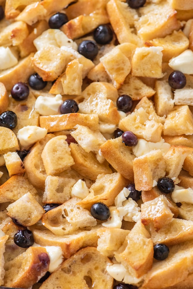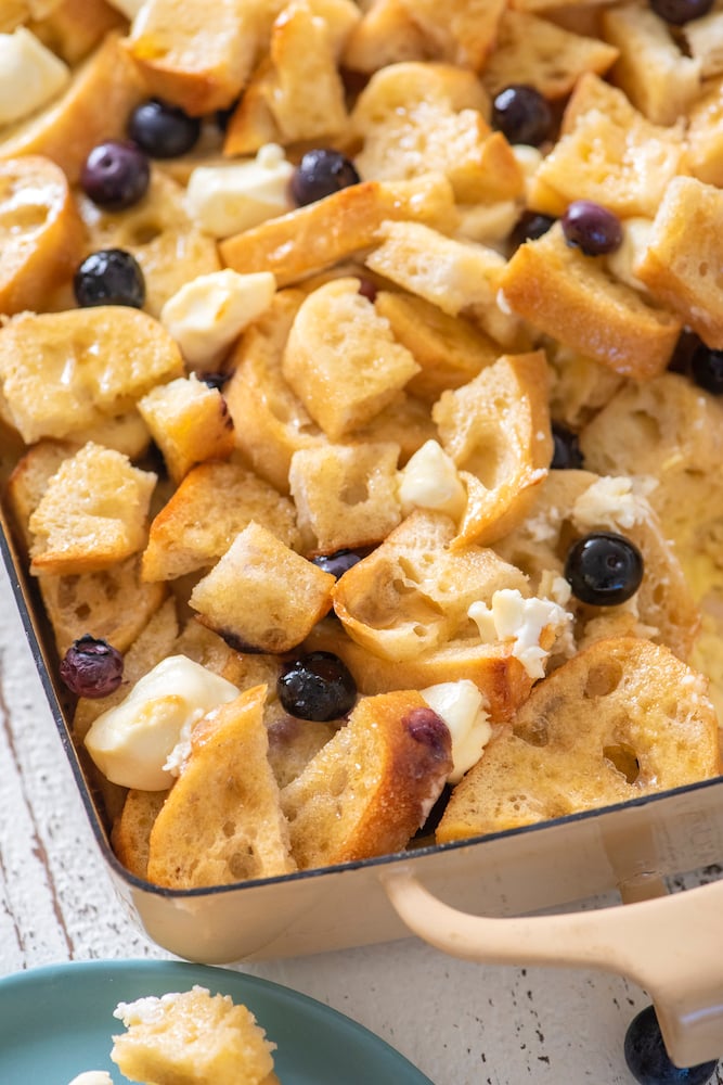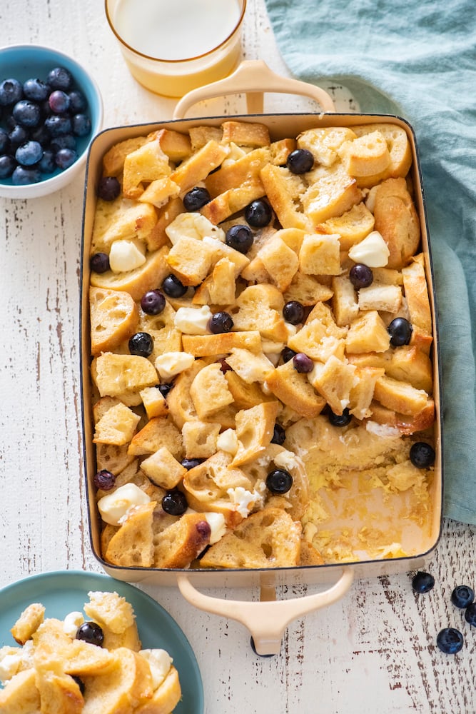 Blueberries are in season now and one of the kids’ obsessions is cream cheese, so I decided to put it all together for this delicious breakfast recipe. Even better, you can prepare the dish up to 24 hours in advance, refrigerate, then pop it in the oven when you’re ready to bake it. This recipe is great to make for a crowd too since you aren’t making individual pieces of french toast. Just prep it and place it in the oven and you’re ready to go!
