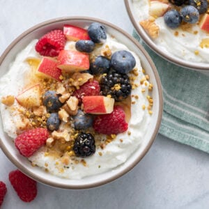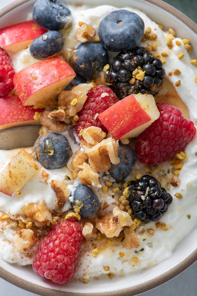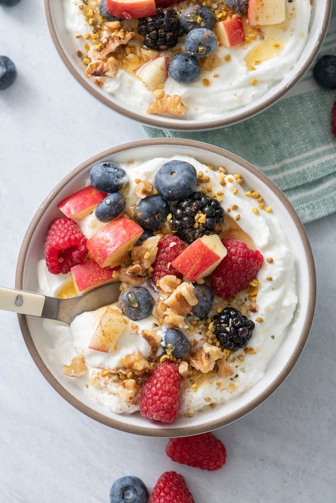 Filled with nuts, berries, cinnamon and Greek yogurt, this Brainy Breakfast recipe packs a big protein punch to keep your brain performing in tip top shape!