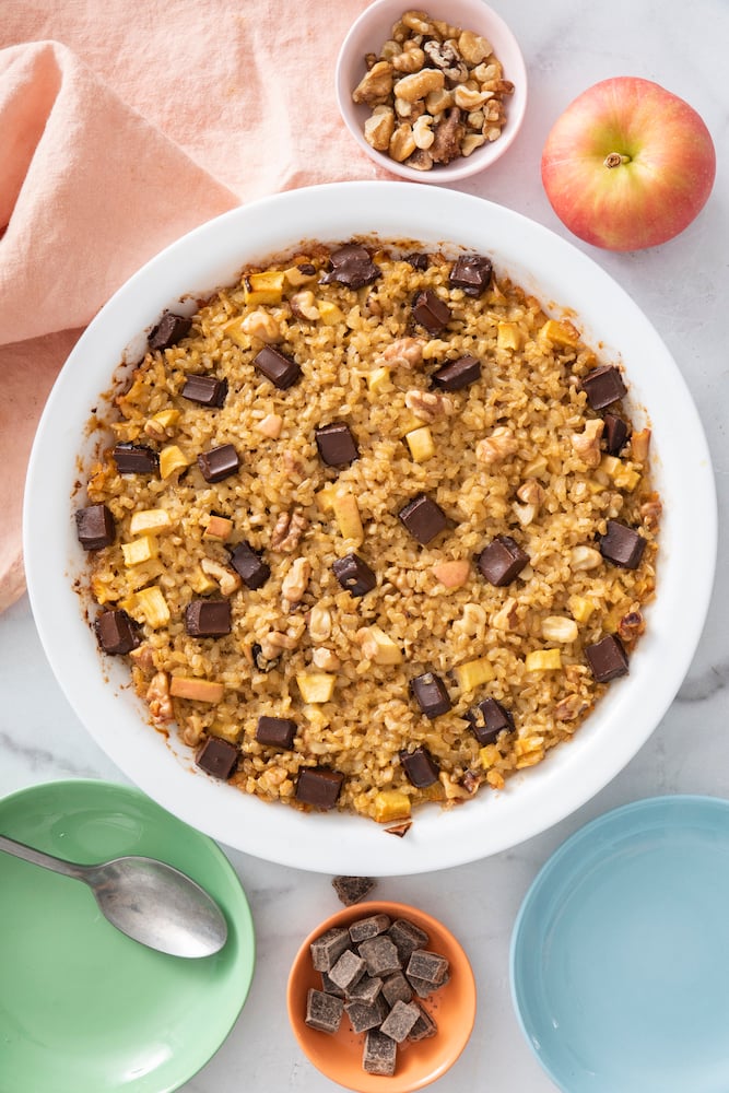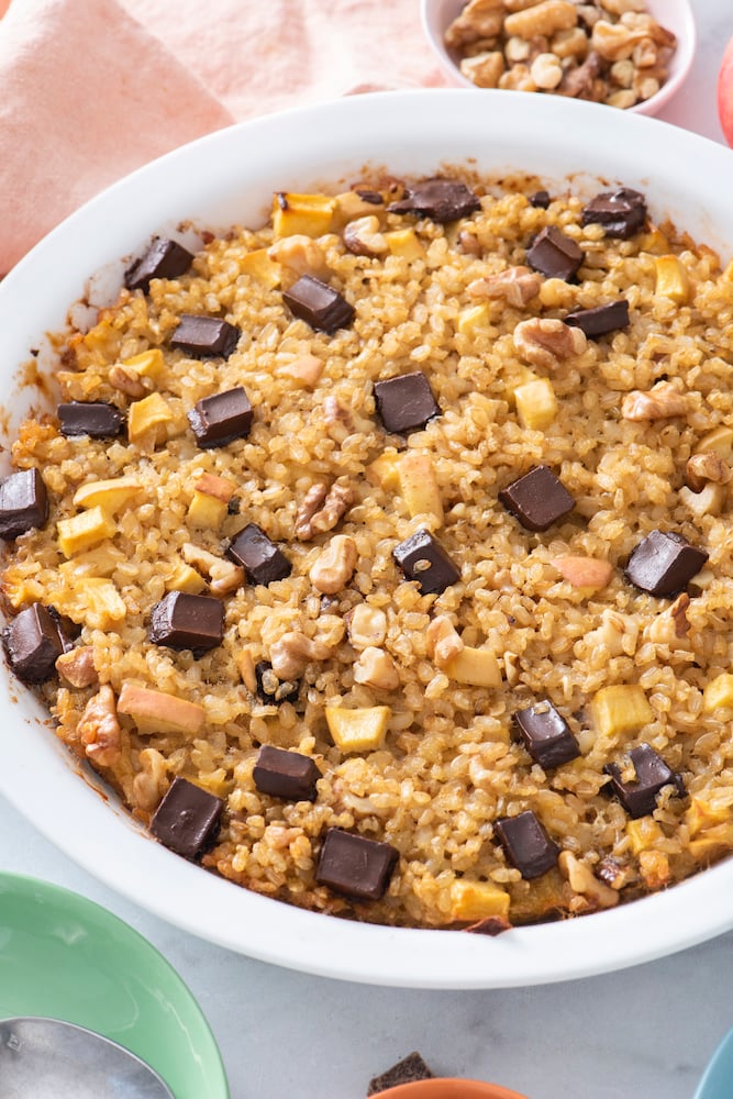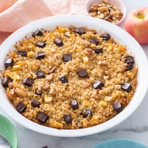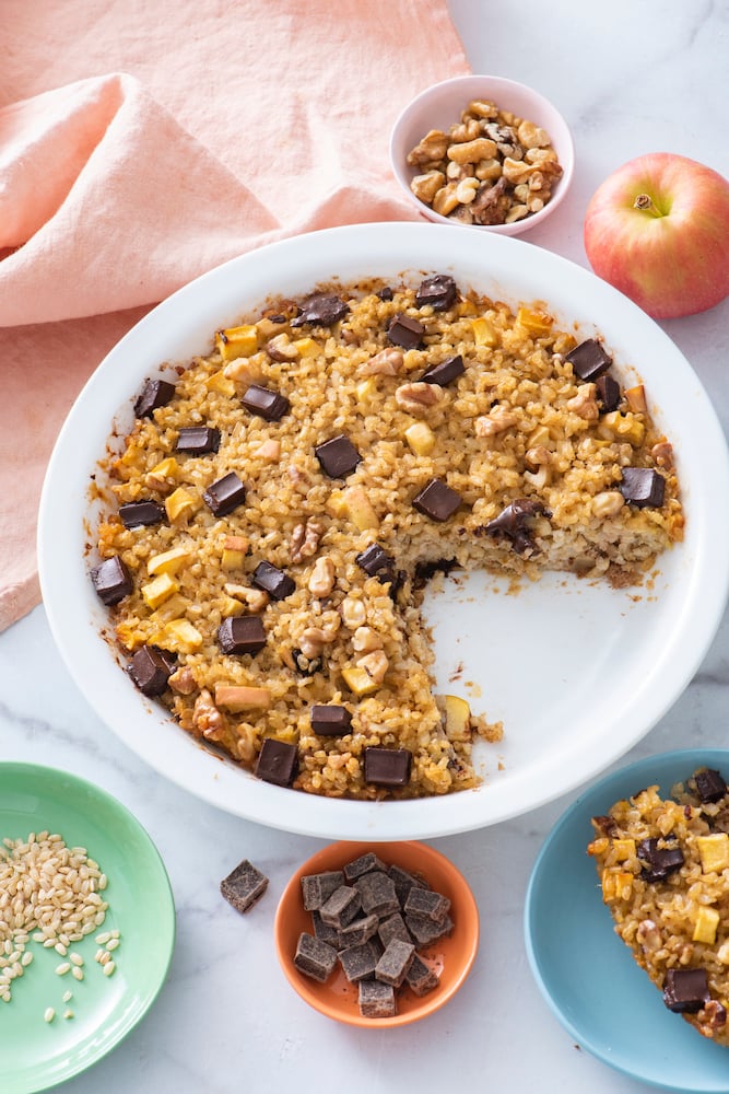For this rice bake, I used apples, walnuts and I topped it off with dark chocolate chips. The maple syrup, vanilla extract and cinnamon added to this recipe give it just the right amount of sweetness without overpowering it.