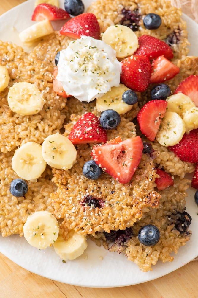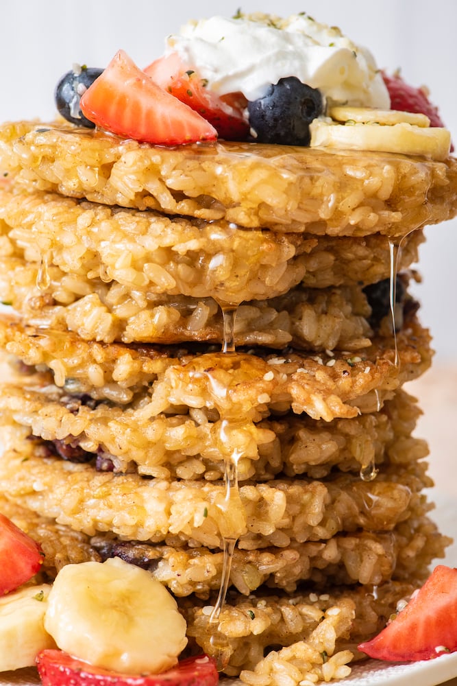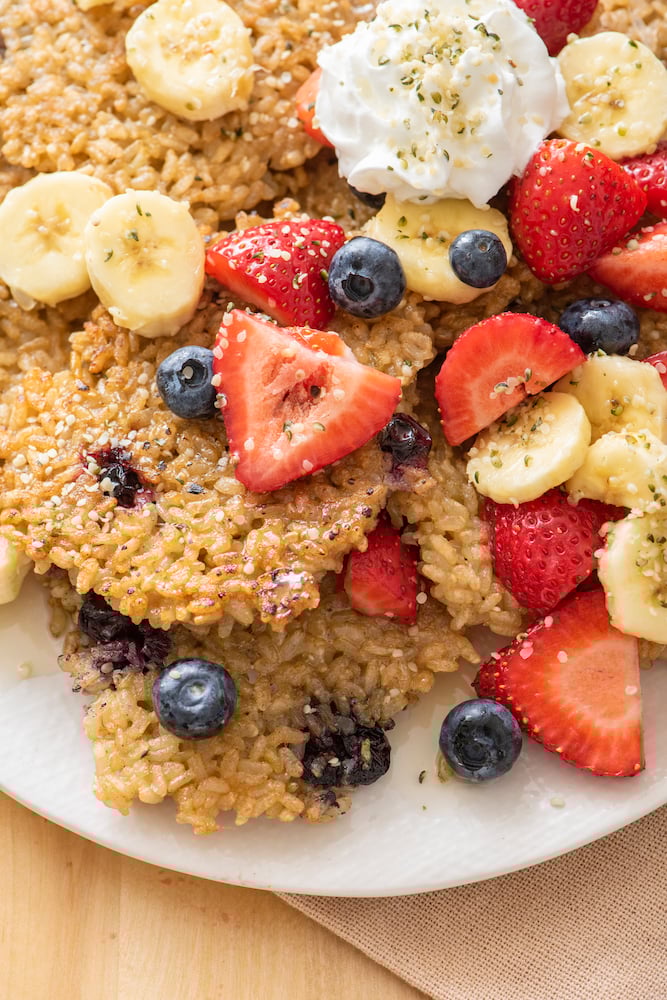 Breakfast Rice Cakes are a revelation. You can add any fresh fruits to them or leave them plain depending on your audience. You can dip them in maple syrup, honey or even leave them plain. You can slather them with greek yogurt or sour cream and even serve them for lunch, dessert or a snack. They’re crunchy on the outside, soft inside and the best part is that you can eat Breakfast Rice Cakes with your hands making them super kid friendly.