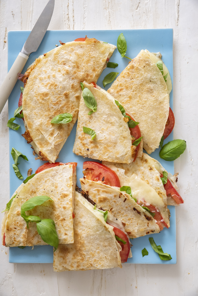 I love a caprese sandwich, which is mozzarella, tomato, basil and just a dash of olive oil, normally on Italian bread. For kids though, caprese sandwiches can be tough to eat because the mozzarella tends to fall out, making the whole sandwich eating thing somewhat frustrating. But that’s no reason to deprive your kids of great Caprese. By simply substituting tortillas for the bread and adding a little heat to melt the cheese, you’ve got the great taste of caprese in an easy-to-hold, kid-friendly format. It’s a blend of two great cuisines that come together beautifully.