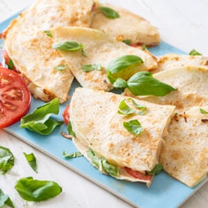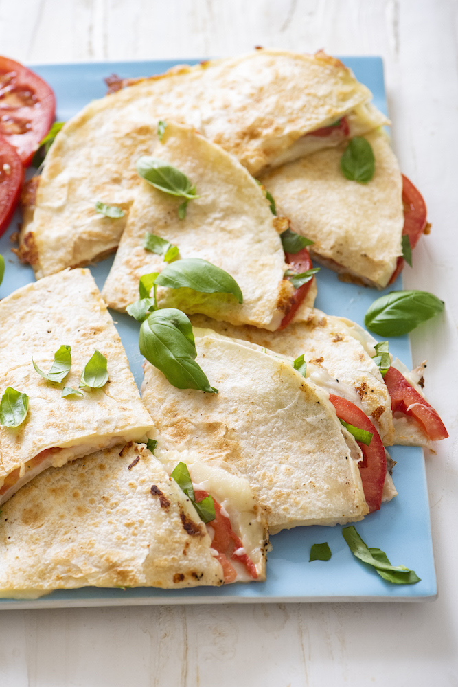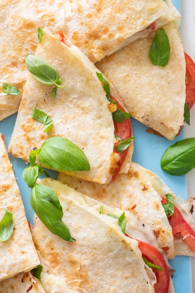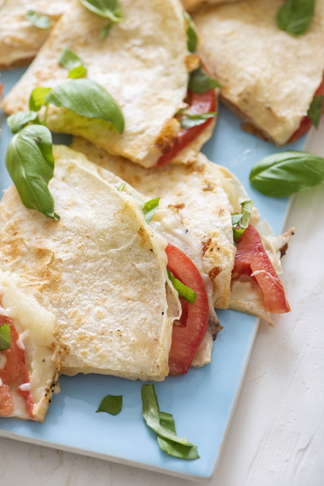 Caprese Quesadillas are the perfect kid-friendly way to serve Caprese! Melty mozzarella cheese, fresh heirloom tomatoes and basil make this quesadilla one for the books.