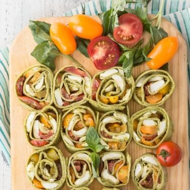 Caprese Wraps have all of summer’s freshest produce perfectly wrapped up. It can’t get any easier. They make a perfect lunch, snack or appetizer for a backyard summer BBQ!