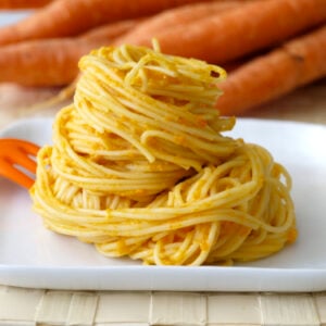 When it comes to my kids, if they’re offered rice or pasta they pretty much could care less what its mixed with. But when I served this Carrot Ginger Sauce tossed with long strands of noodles they were dubious. What was this “orange pasta” sitting on their plates?
