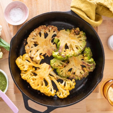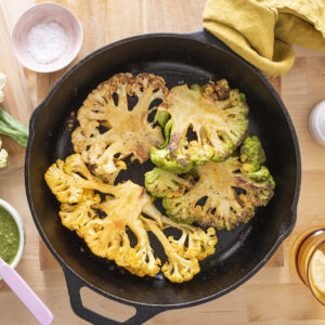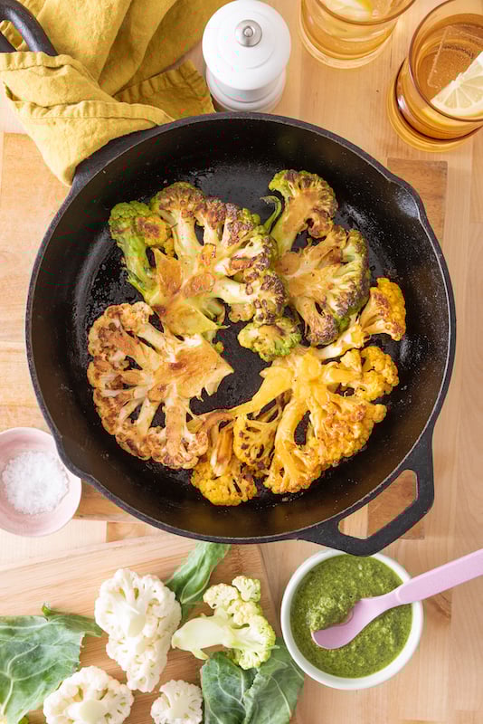 Like I said, these Cauliflower Steaks are a really great plant based entree, but they also would be perfect as a side to pair with another main dish like Moroccan Chicken, Southern Style Pork Tenderloin or Simple Broiled Salmon if that’s what you’re looking for. This recipe uses super simple spices but is still super flavorful. Cooking them in a cast iron skillet in a super hot oven gets the steaks nice a tender but also beautifully browned. Also, if you don’t have a cast iron skillet I highly recommend getting one, but if not, any oven safe pan will work.
