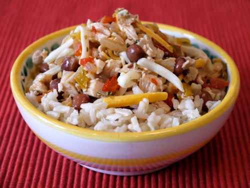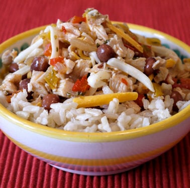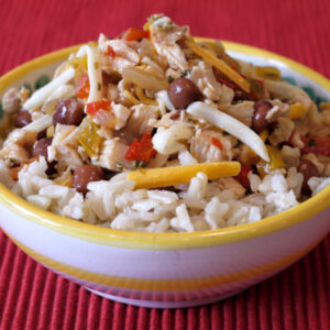 When it comes to Chicken Fajitas, the most common way to eat them is placed in a warm tortilla and topped with a variety of accompaniments. But what do you do if you have leftovers or even if you decide to make a double batch of it like me? In our house we use the original recipe the first night and on the second day turn it into Chicken Fajita RIce Bowls. As delicious as fajitas taste wrapped in a tortilla, when the spiced chicken and vegetables are chopped fine, mixed with cheese and beans and placed on top of warm rice, you may be inspired to serve them this way all the time!