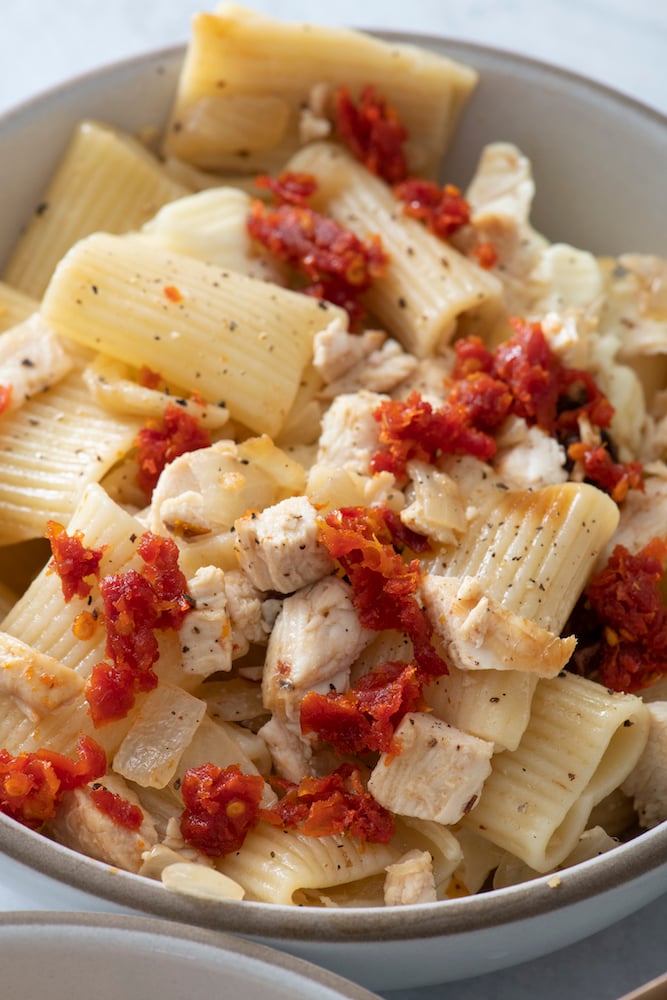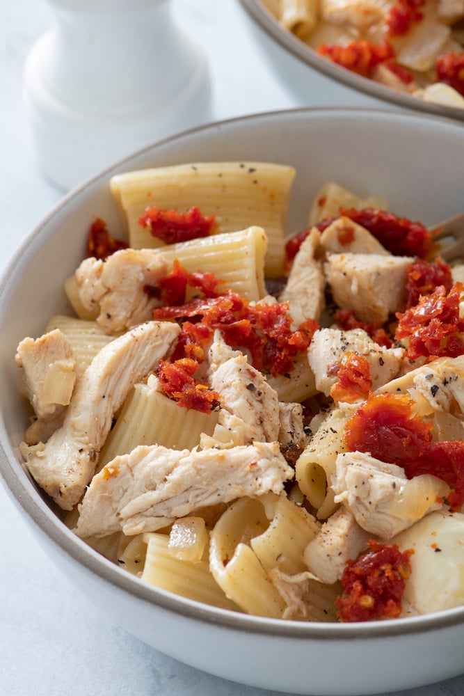 If this recipe sounds right up your alley, but you (or someone in the family) is vegetarian, you can totally sub tofu or just leave out the chicken entirely. It’s still a satisfying, flavorful dish no matter what. The sautéed onions and sun dried tomatoes are a perfect pair providing a super simple but impressive taste!