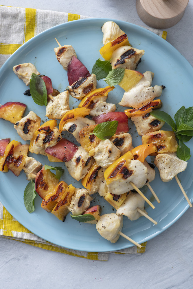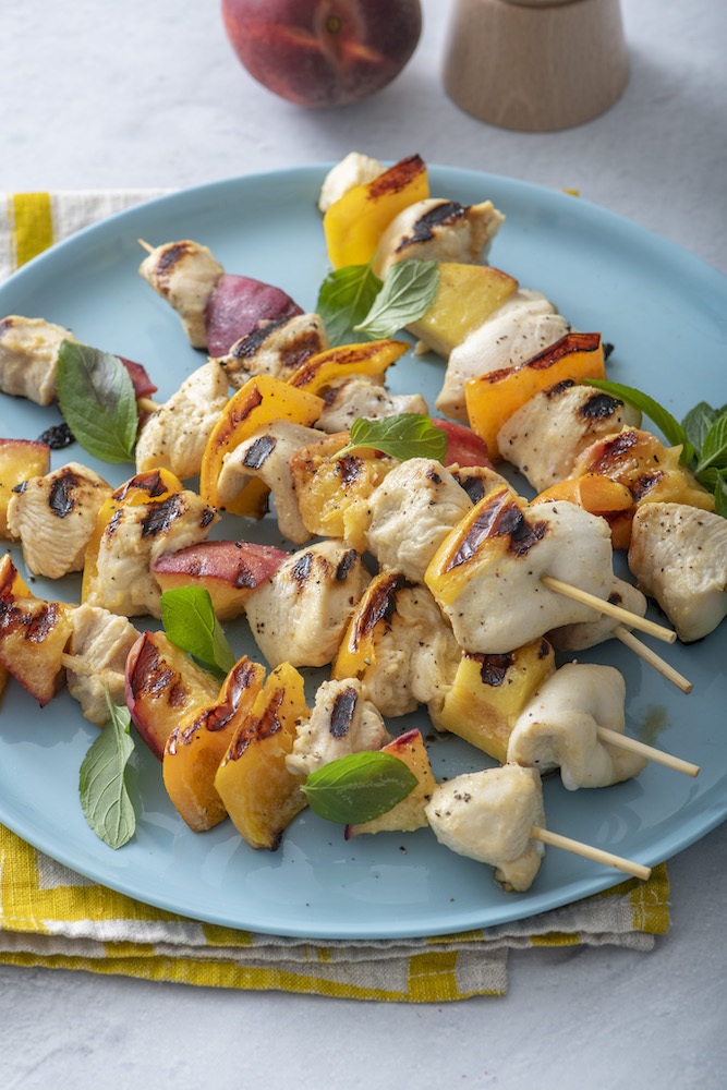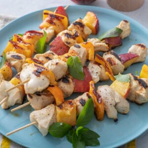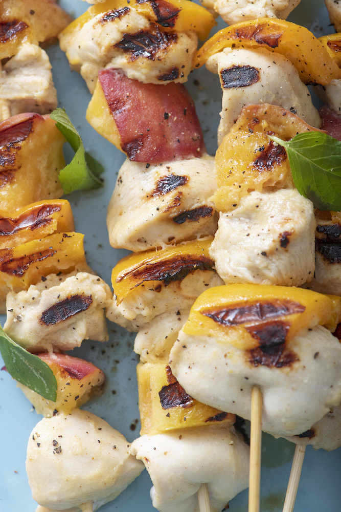 These Chicken, Peach and Bell Pepper Skewers are marinated in a tangy, sweet marinade that is beyond delicious. They’re a perfect recipe for your summer BBQs!