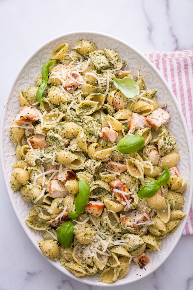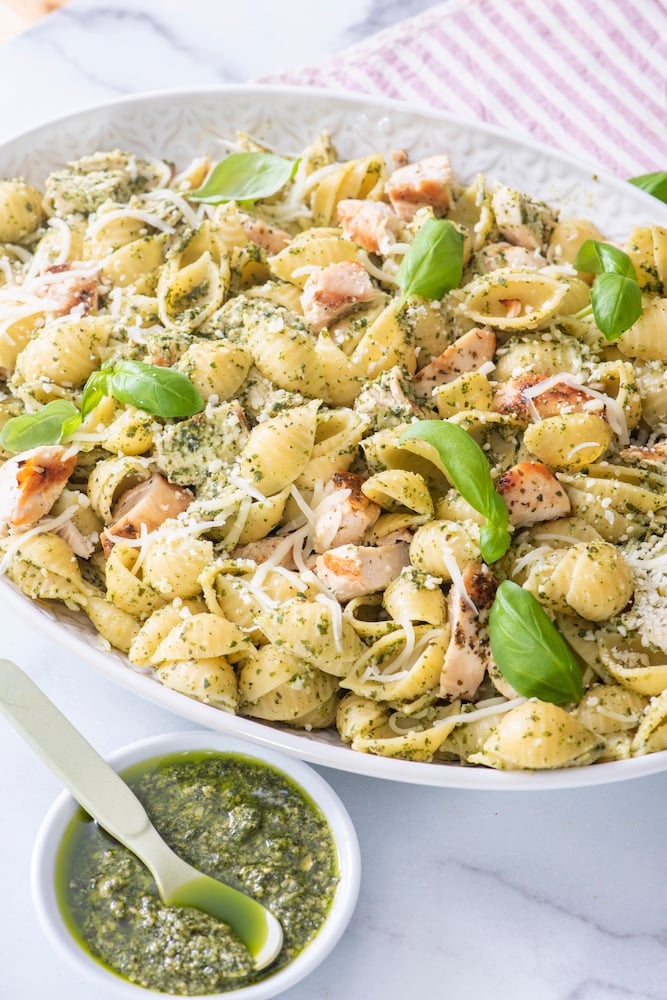 - Mix in the pesto, chicken, parmesan, mozzarella cheese, and salt, and serve.