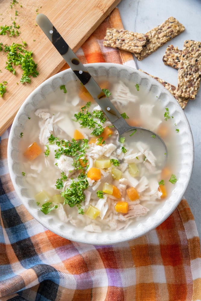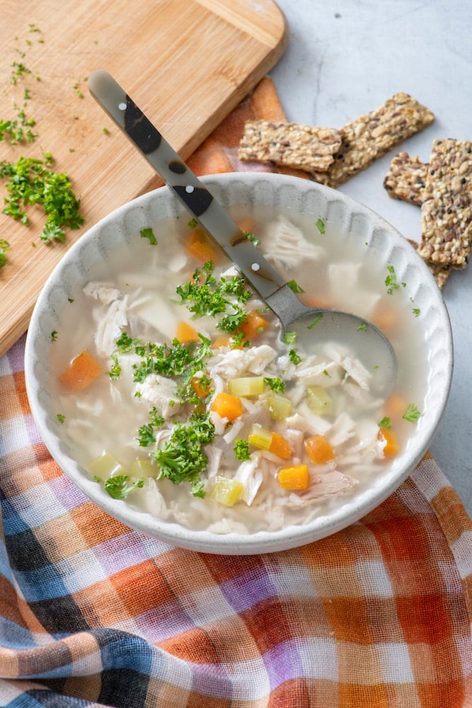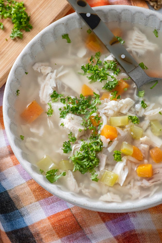 - Add the chicken and parsley to the soup, reheat and serve. Feel free to add salt to taste.