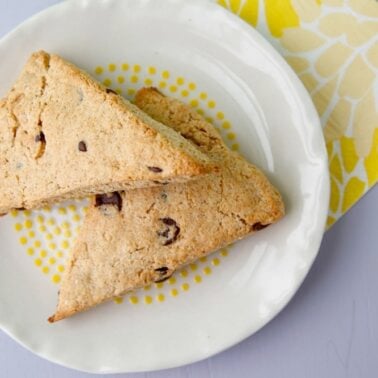I well remember the first time Kenya chose scones over other scrumptious items in the bakery case. It instantly brought me back to that trip to England and I was kind of surprised at how much he loved them. That was years ago and since then, I’ve been making these not-too-sweet baked treats in a variety of flavors. Most recently I came up with this whole wheat chocolate chip scones version specifically for Chloe, my little chocolate lover. They’re tender and flakey, utilizing white wheat flour for some added nutrition, and of course, little nuggets of chocolate in every bite.