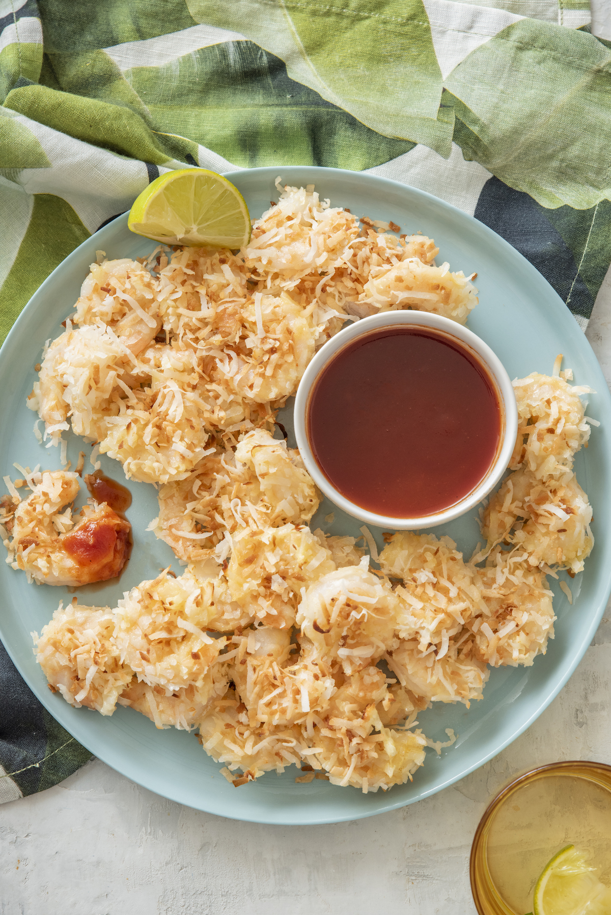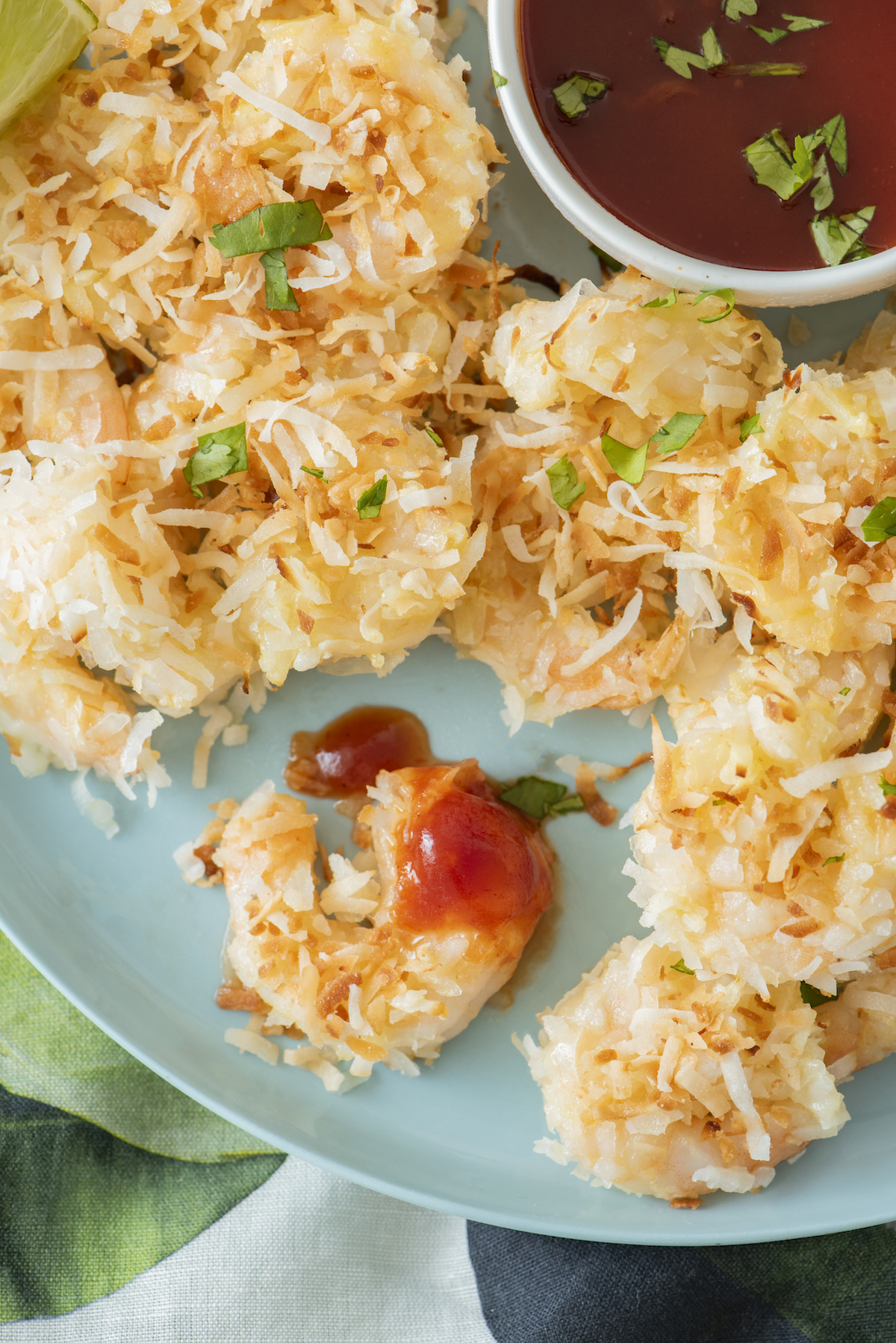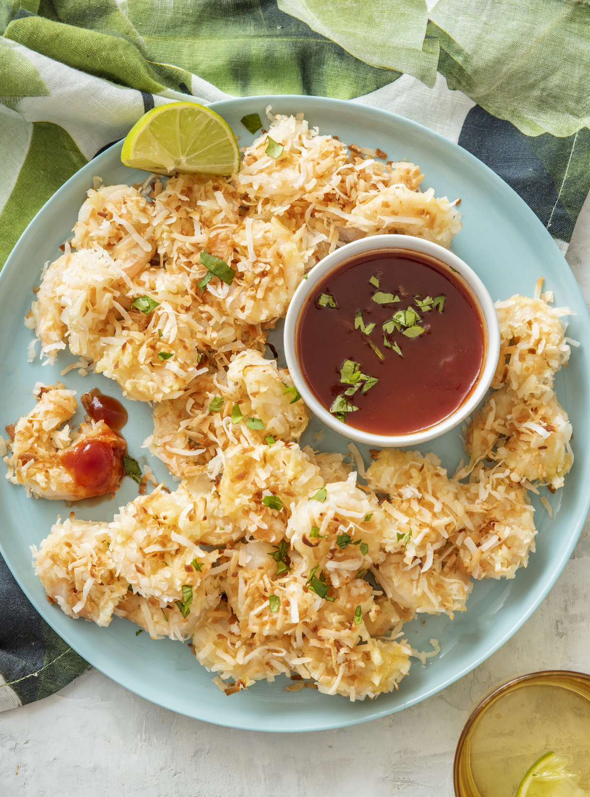 I love using my air fryer for this recipe! It’s super simple and a healthy alternative to deep frying. To air fry coconut shrimp, place breaded coconut shrimp in a single layer in the air fryer basket. Spray them with a little bit of cooking oil and air fry on 400°F for five minutes or until golden.