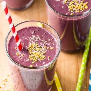 By waking up daily to a glass full of the massively nutritious foods in this Crazy Healthy Smoothie, he walks out of the house every morning with a bang and says he feels amazing throughout the day. This recipe is his, and when I first saw him making it I thought he had went a bit overboard, as he packs a lot of food into one glass. He tosses a banana, a whole beet, a carrot, fresh and frozen berries (although any fresh or frozen fruit will do), persimmon, kale, bee pollen, walnuts, hemp hearts, almond milk, dates and flaxseeds into the Vitamix (essential for grinding everything up nice and smooth), and then divides it into glasses for our whole family to enjoy so we can all get a boost of yumminess alongside whatever I am making like Cottage Cheese Pancakes, strawberry parfaits or a Cheese Omelette.