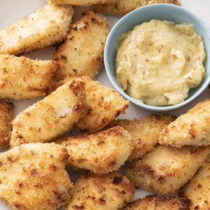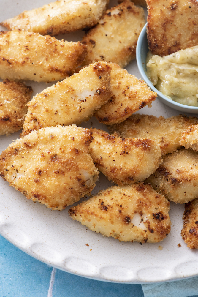 These Crispy Fish Fingers live up to their name. They are seriously crispy on the outside, and moist, flakey and mild in flavor on the inside. They’re delicious and nothing like the boxed kind you may have been forced to eat as a child — for starters, they’re made with just a handful of ingredients and therefore a whole lot healthier. Plus, with just a light coating of herb infused mayonnaise for the bread crumbs to grab onto, it’s like having a little tartar sauce baked into every bite.
