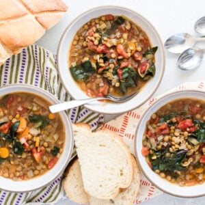 It’s been cold, rainy and — thankfully — really quiet here after the holidays, which means there’s plenty of time for me to make warm cozy soups to fill everyone’s belly. Even though I’ve been in less of a rush than usual, that doesn’t mean I’m not looking for ways to make life easier for myself in the kitchen. We love using lentils for an easy source of plant-based protein. When we’re not making this soup, we’re making Baked Farro with Lentils, Tomato and Mozzarella, Lentil Mushroom Bolognese or Smoky Red Lentil Stew!