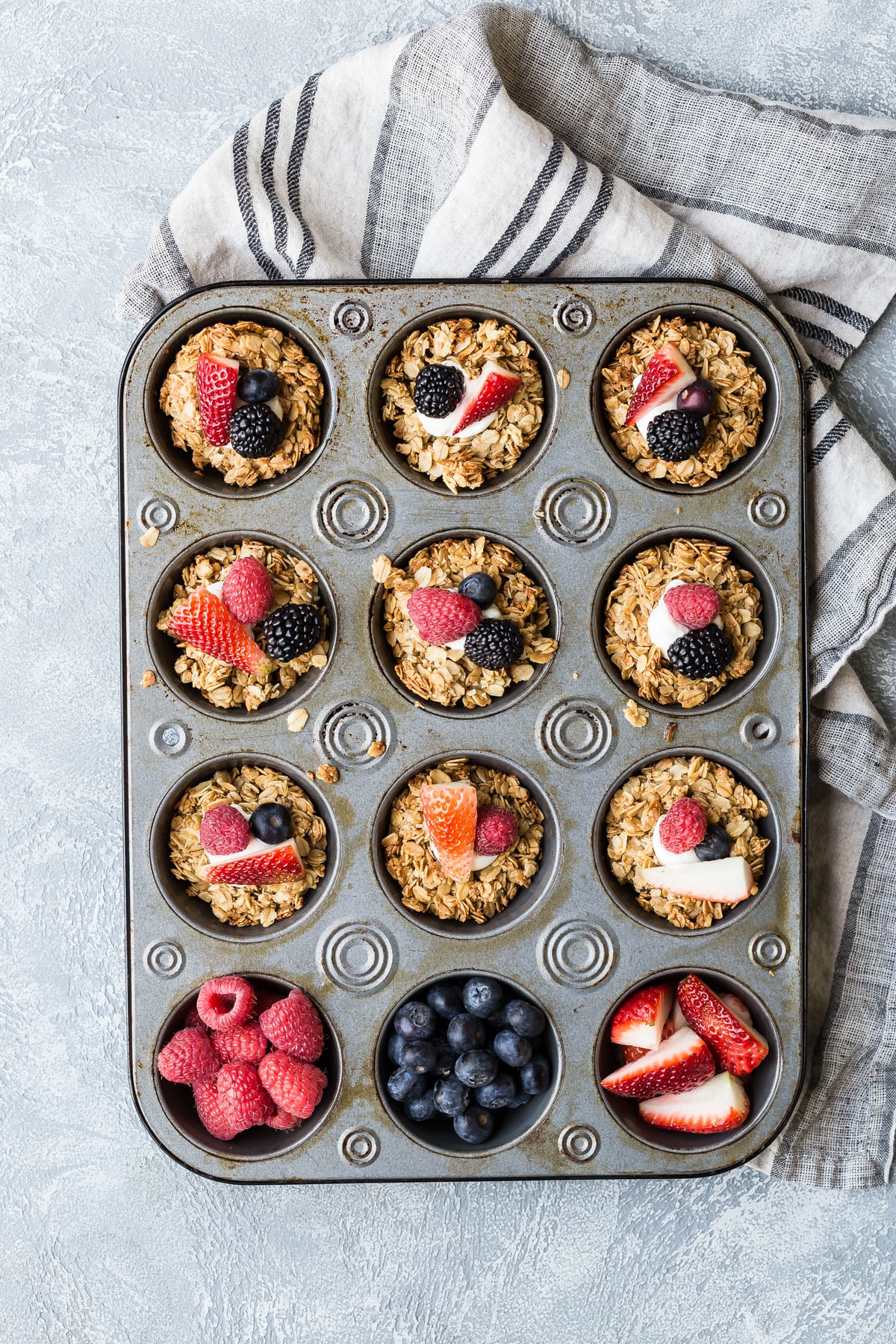 - Top granola muffins with 1-2 tabspoons of greek yogurt and top with a variety of fruits.