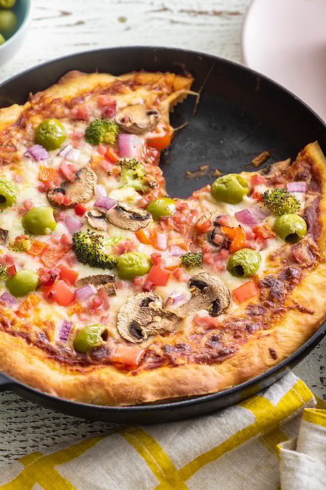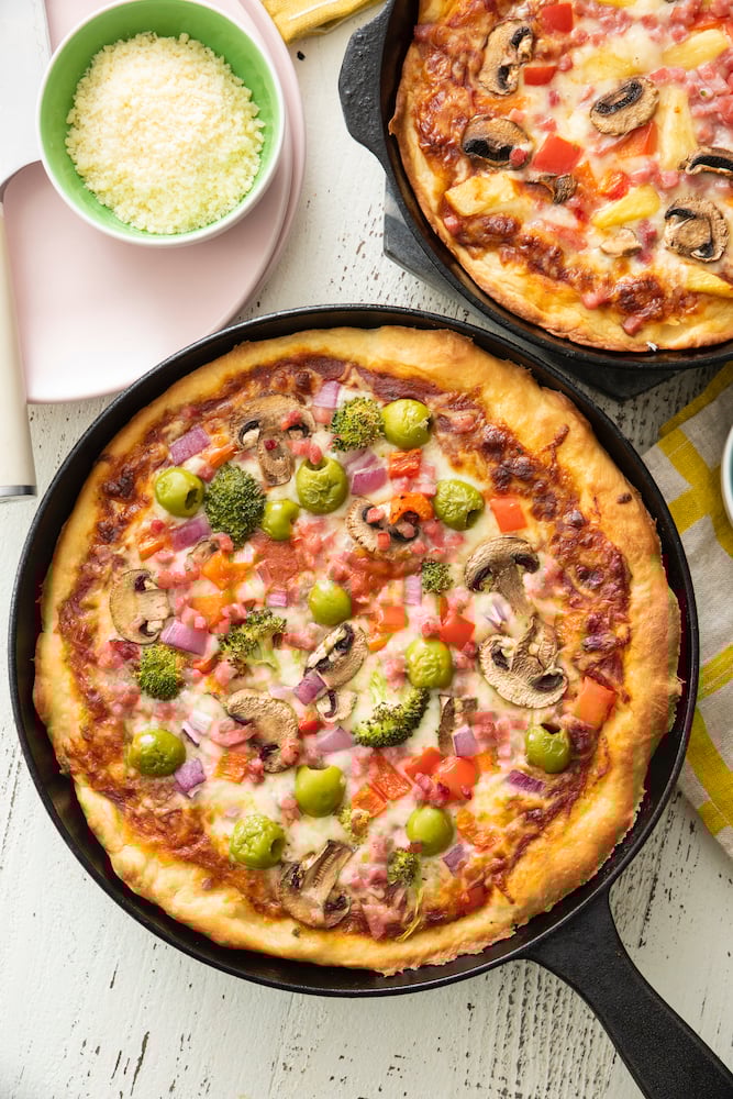 Deep Dish Cast Iron Pizza should definitely be the recipe for your next family pizza night. Everyone will love it! Tag me on social media with your creations. I want to see all the toppings you choose!