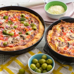 Deep Dish Cast Iron Pizza is inspired by the classic Chicago style deep dish pizza so many people (including my whole family) know and love. It’s perfectly crispy on the outside, doughy on the inside, and piled with lots of cheese and toppings! What’s not to love?