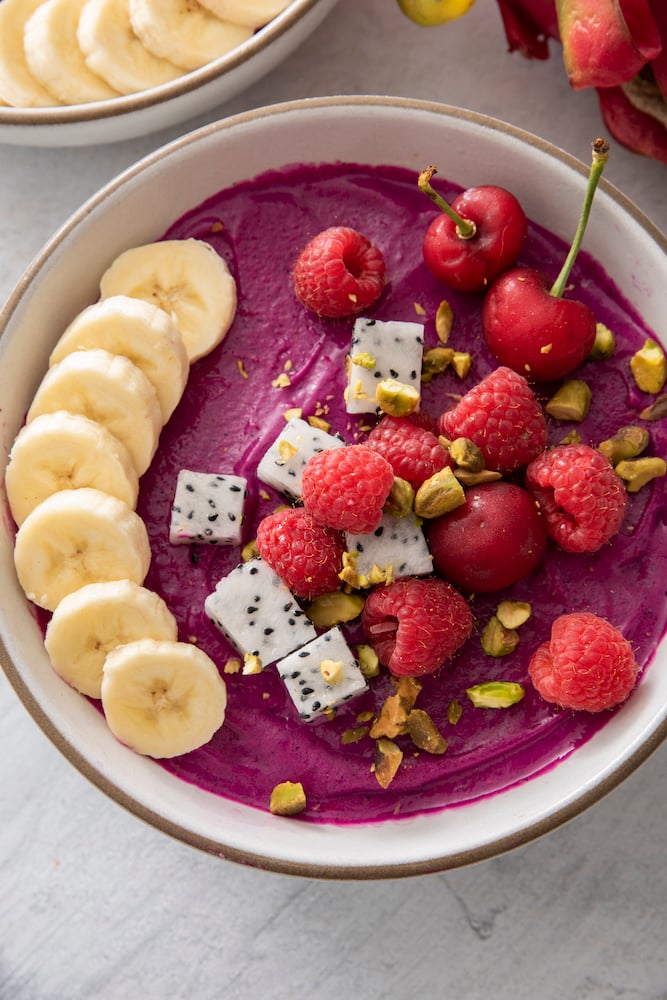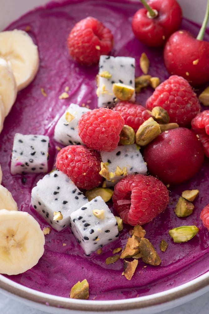 The reason I love this smoothie bowl (besides how it tastes) is because dragon fruit (aka pitaya) is packed with vitamin C, iron, fiber, B vitamins and calcium. Pair that with raspberries which are crazy rich in fiber, and you’ve got a smoothie that will keep you energized with antioxidants and pretty darn regular too (TMI?!).