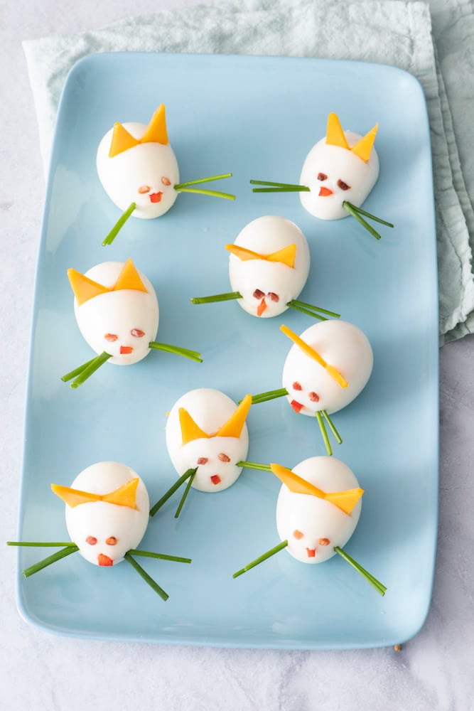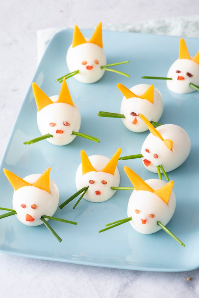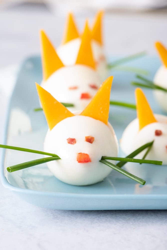 - Using a sharp knife cut a slit in the top of the egg closest to the narrow side and slide in 2 cheddar cheese triangles to resemble bunny ears.
