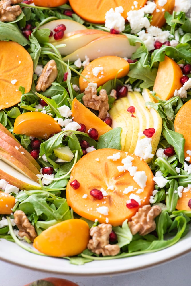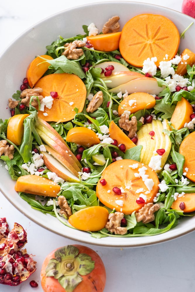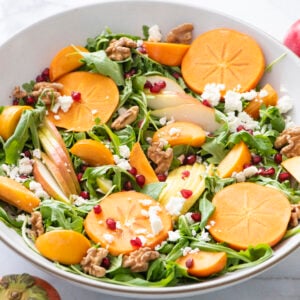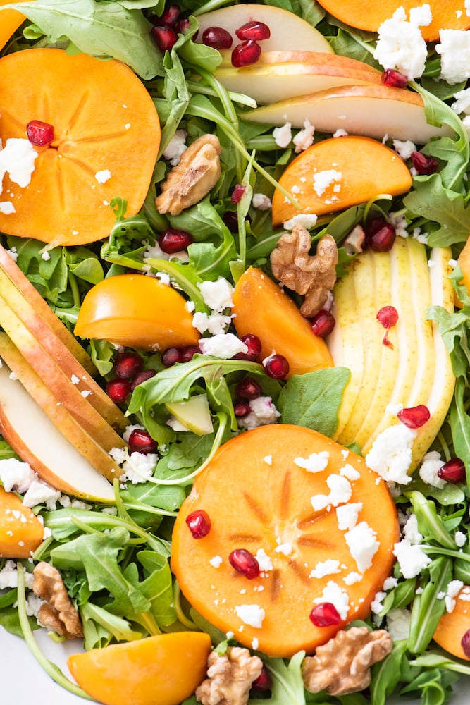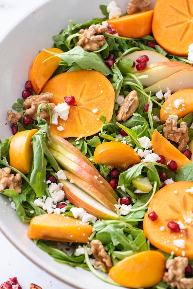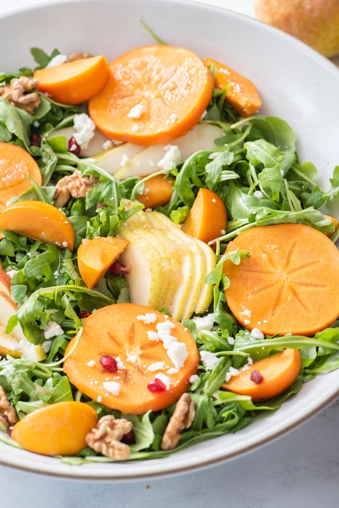 I love the fall because that means pears and persimmons are in season. They’re some of my favorites and I can’t wait every year for them to be available at the farmers market. The bright orange color from persimmons dresses up any dish to look so beautiful, not to mention they are so delicious. This salad will take any dinner table to the next level.