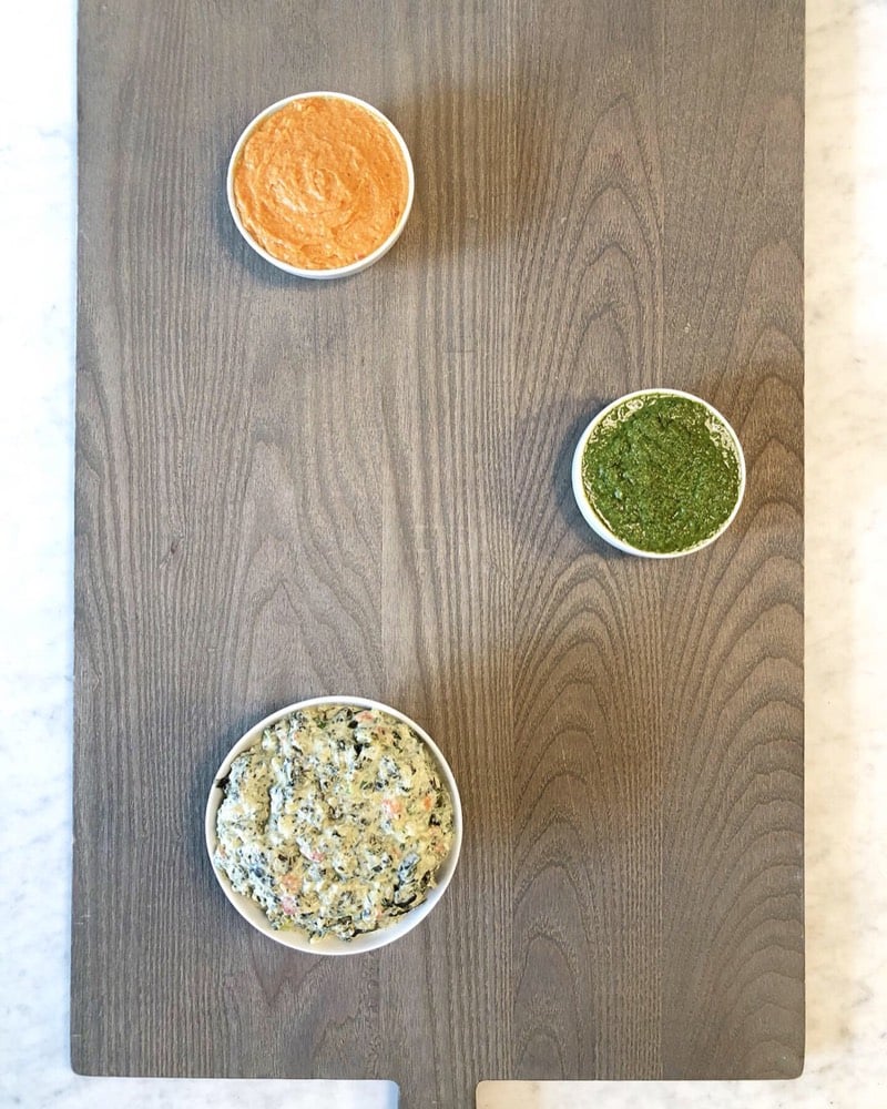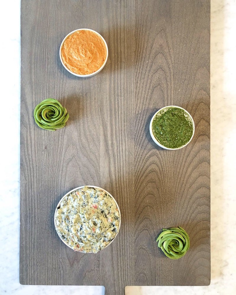 Pictured here are Red Bell Pepper Hummus, Veggie Dip, Kale Pesto, and two Avocado Roses.