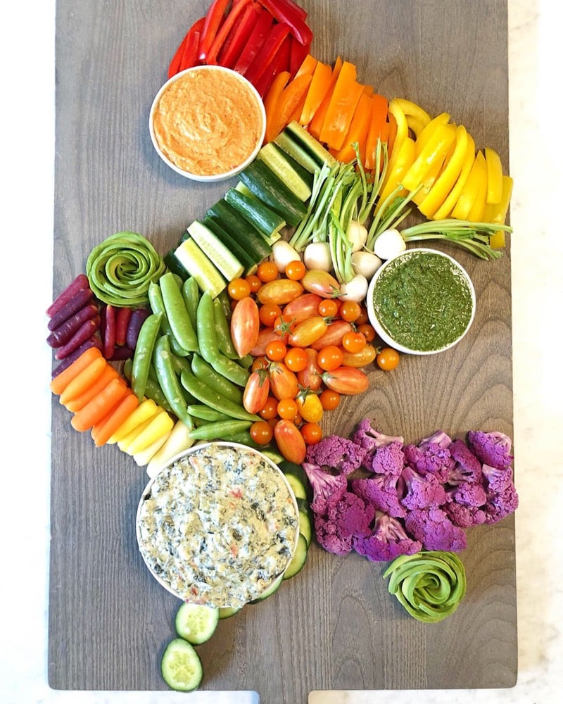 Now for the veggies: I like to keep the same veggies together, and I put these down surrounding the dips (since you probably won’t be dipping your fruits in pesto!) This is where you’ll create some movement. I like to make a sort of “S” or “Z” shape with the veggies.