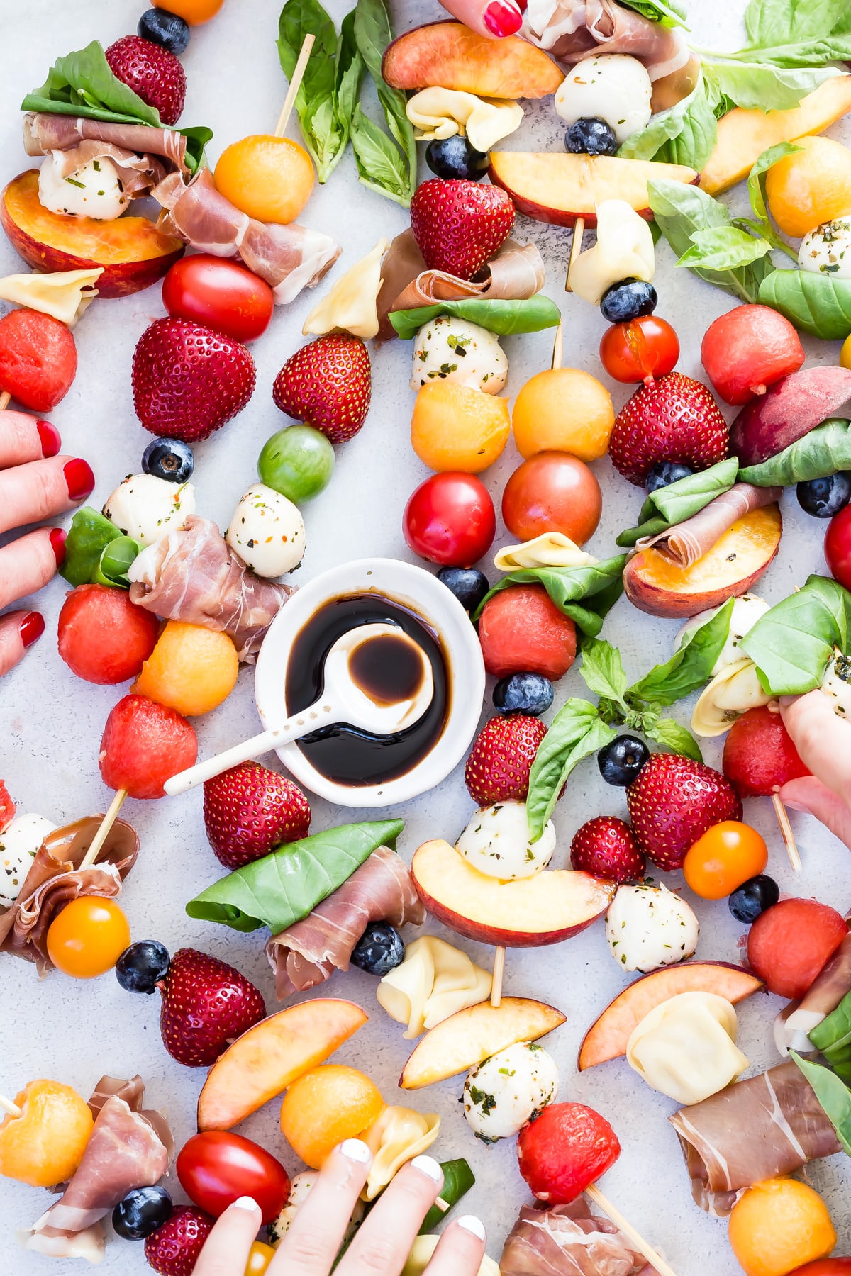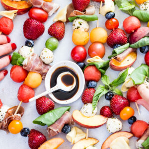 Over the years we’ve made DIY Tacos, DIY Oatmeal, even DIY Salad as a way to include kids at meal time, but for a casual party with friends and family these Fruit Caprese Kabobs will be a sure fire hit! You can fill bowls with mozzarella, strawberries, blueberries, cherry tomatoes, tortellini, prosciutto, basil leaves, and more. Then let everyone skewer their choices and finally give a drizzle or dip of reduced balsamic vinegar that’s like dipping the skewers in candy!
