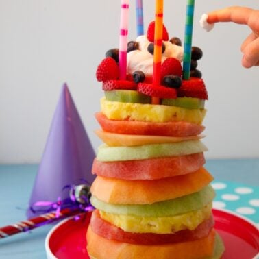 I’ve made this healthy Fruit Tower Birthday Cake a ton of times and my kids can never get enough of it. You can stack as high as you want (or as high as the tallest skewers you can find), and add tons of whipped cream (ok, this is the one thing that makes this recipe a bit less healthy) and berries on the top for even more elevation. Wait until you see the look on your kids’ faces when they see you bring this cake out. I’m betting you’ll get an even bigger reaction than what you would with a typical birthday cake. I made a Fruit Tower Cake for Dr. Seuss Day at my kids’ school and Kenya and Chloe tried to devour the entire thing before dinner (as you can see here)!