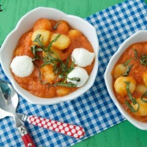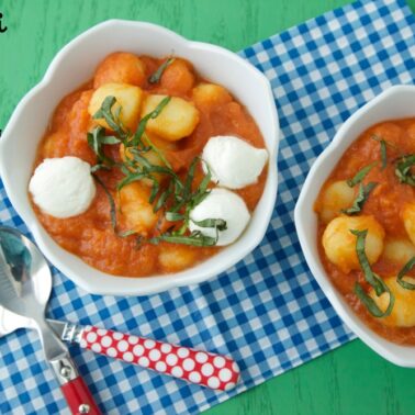 Regardless of whether you buy your gnocchi in the store or start from scratch, for this recipe I spotlight the luscious sauce which I use to gently coat the gnocchi before tossing them with fresh basil from our garden, dropping in plump mozzarella balls — which soften and melt the moment they hit the dish — and finishing off everything with a light dusting of Parmesan.