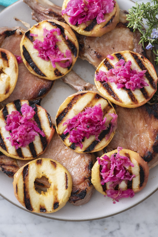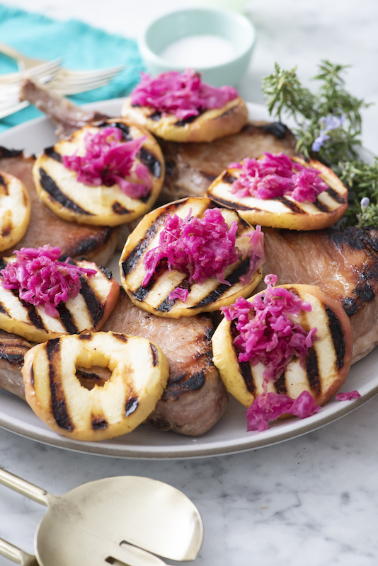 - Serve grilled pork with grilled apples and fresh sauerkraut.