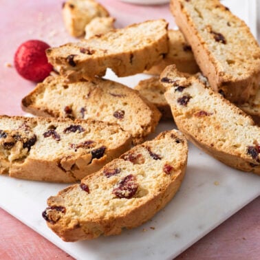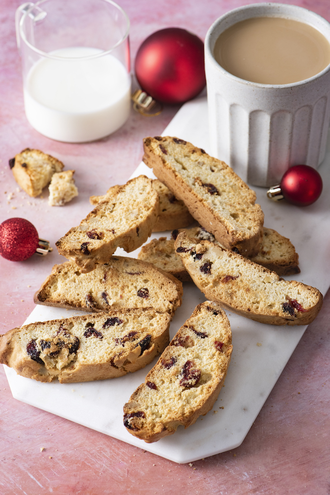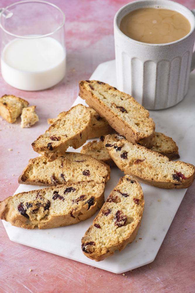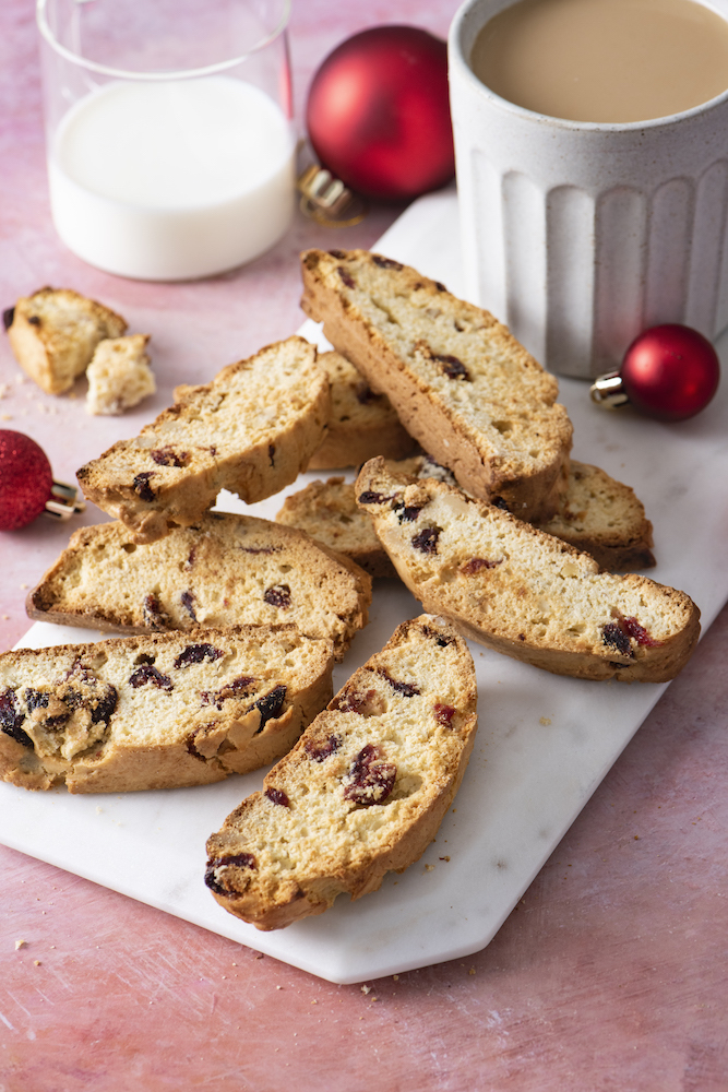 So popular was this recipe with my gang, I had to make a second batch by popular demand! With a hint of orange zest and vanilla, a crispy texture and sweet bites of dried cranberries, these biscotti are great to keep on hand or give as a gift (if you can handle parting with them). We make this crispy bread every year for gifts along with mini Persimmon Cakes, Cheese Wafers and Chocolate Orange Snaps.