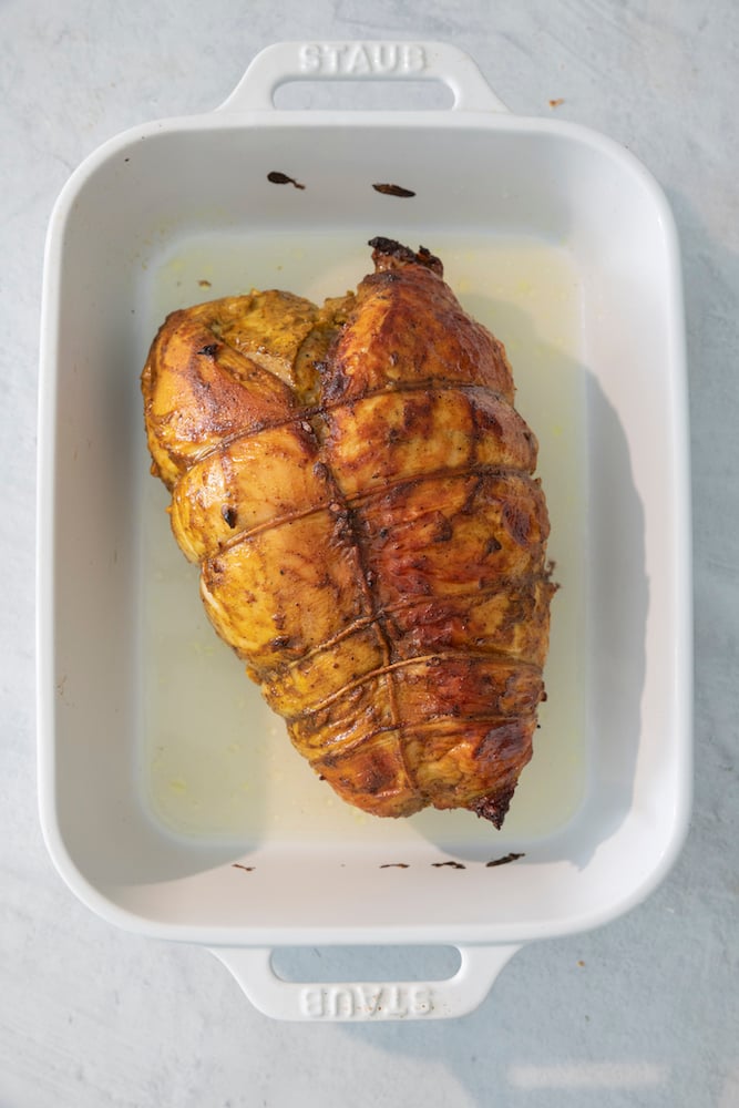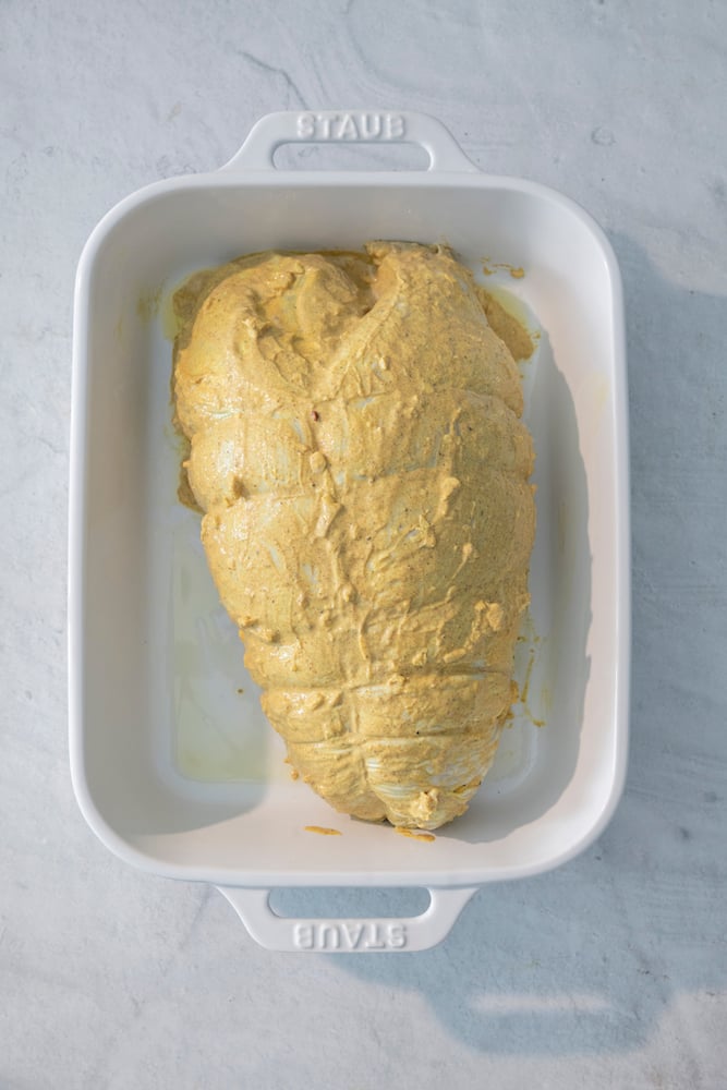 Marinate the Turkey: The KEY to this roast turkey breast is the marinade. It’s made with greek yogurt as the base which helps tenderize the meat and keeps it juicy and moist while it roasts. You’ll want to marinate in the spices for at least an hour at room temperature or you can marinate in the refrigerator overnight.