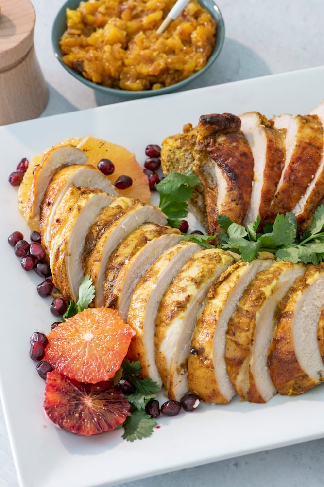 This roasted turkey breast is marinated in greek yogurt with tons of spices native to India like cumin, cinnamon, turmeric and garam masala. I must say, it turned out super tasty! Instead of the traditional Cranberry Sauce I usually serve with my Thanksgiving turkey, I quickly cooked up an Apricot Apple Chutney which turned out to be the perfect sweet accompaniment to go along with this juicy turkey breast.