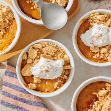 • What size ramekins do I need for these mini pumpkin cheesecakes? I used eight 6 ounce ramekins to make these! If yours are a different size, you may need to adjust the cooking time accordingly.