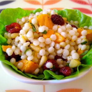 Whenever Trader Joes starts selling a new product, I get excited. Finally, Israeli couscous! Don’t worry if you don’t have a Trader Joe’s, though, you can buy it at most groceries. For some reason I usually cook with fine couscous, but unlike its smaller cousin, Israeli couscous looks like tiny pearls and have a wonderful, light texture.