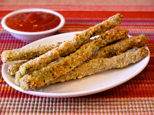 - Place all of the coated sticks on the baking sheet/rack. Arrange so they’re not touching, spray lightly with oil and bake for 30-35 minutes or until the bread crumbs are golden.