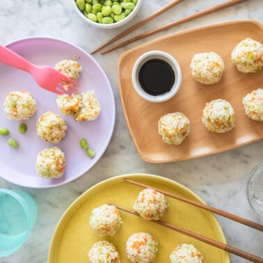 Also known as Onigiri, these delicious rice balls are made from steamed rice rolled with small pieces of veggies and fish. The perfect bite size food for toddlers, and adults love them too!
